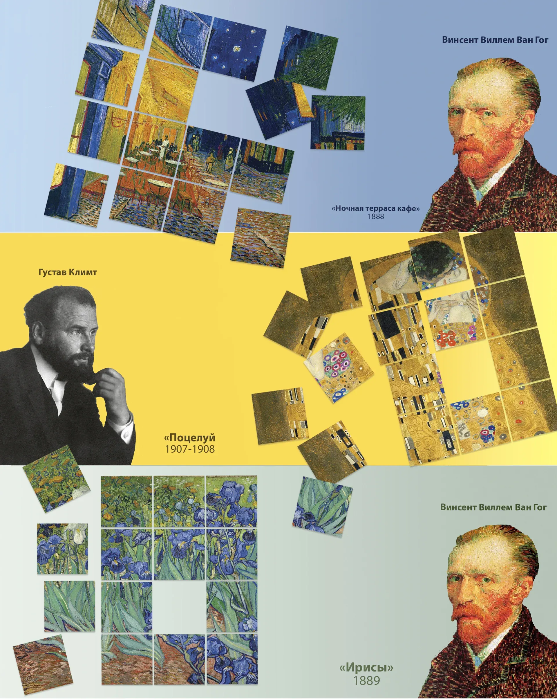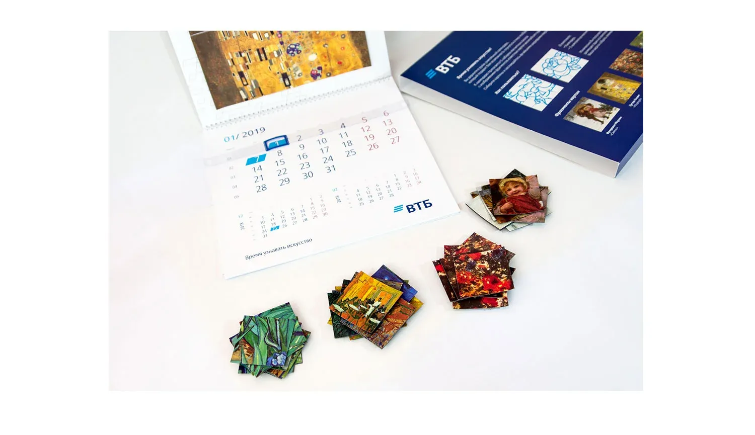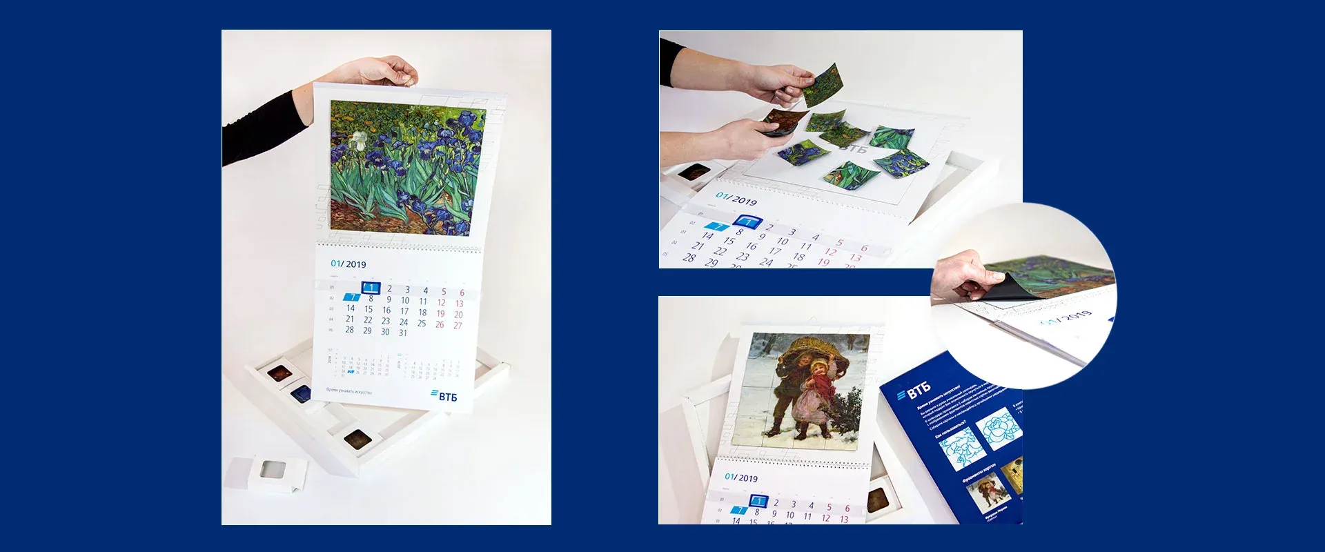 Данная концепция календаря предусматривает коммуникацию с его обладателем. Мы разработали календарь таким образом, что у его обладателей появляется возможность в любой момент поменять картинку без какой-либо привязки к месяцу, и не просто поменять, а самостоятельно собрать красивую репродукцию.
