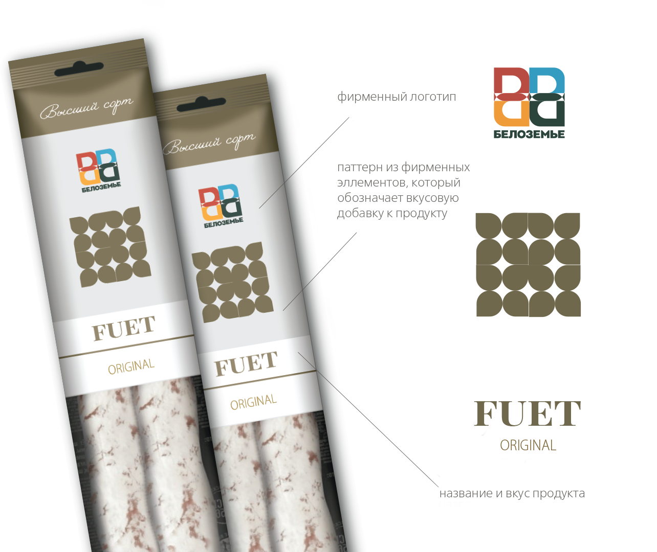 Выход на рынок премиальной линейки фуэтов поддерживает выход на рынок бренда «Белоземье». В креативной концепции мы используем фирменные элементы в премиальной цветовой гамме, акцентируя внимание на высоком качестве продукта и его принадлежности к агрохолдингу. При этом каждое SKU выделяется своим (немного измененным) паттерном и цветом, которые подбираются в зависимости от характеристики продукта.